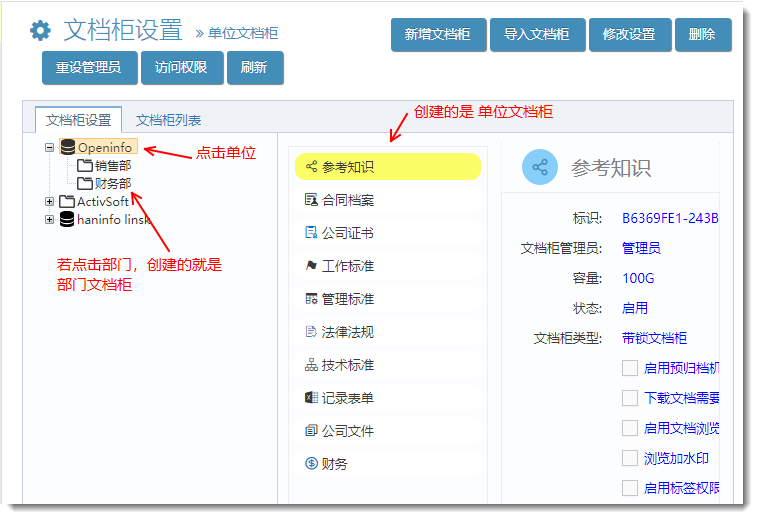1)創(chuàng)建(文檔柜),并設置文檔柜管理員及文檔柜回收箱管理員。(文檔柜管理員與回收箱管理可以是不通的人;超級管理員不能是文檔柜管理員)
