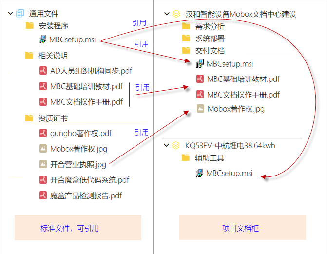 Mobox的引用文件管理功能與制造業(yè)中的借用件管理很相似。完美的解決了一個文件在不同文檔柜、文件夾中的多次出現(xiàn)(降低的存儲空間),也可以實現(xiàn)原始文件修改后,引用該文件的文件夾內的文件也會自動更新。