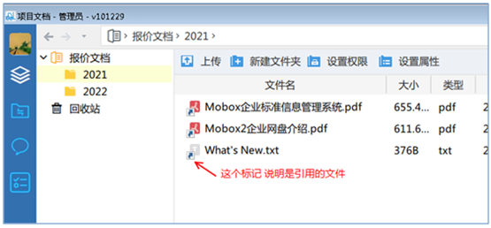 這種管理方式好處是簡單,壞處是無法體現(xiàn)這是一個相同的文件。Mobox文檔管理系統(tǒng)可以很好的管理這類文件。我們的相同文件存放在不同的文件夾,采用了引用文件的方式來管理。