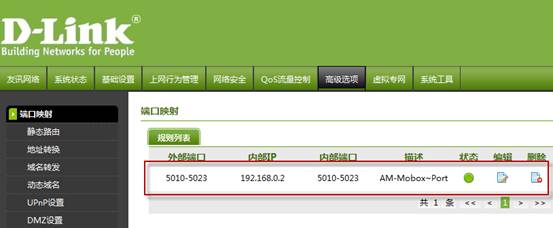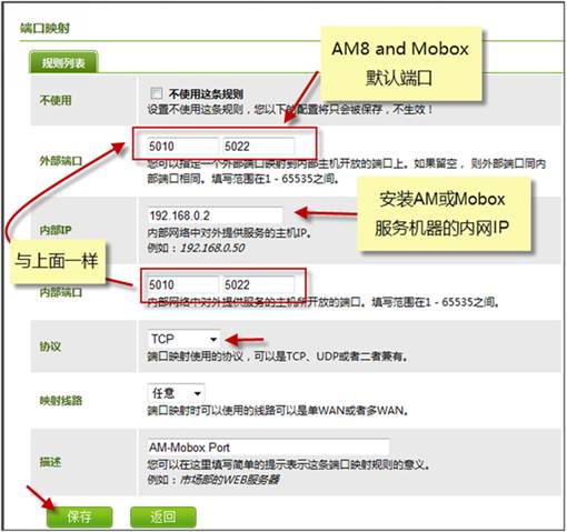 將Mobox企業(yè)云盤相關服務所用到的端口(默認是 5010~5022)進行端口映射設置,若自己與改過Mobox服務端的端口,則按實際的端口配置 (AM即時通的端口也是一樣的)