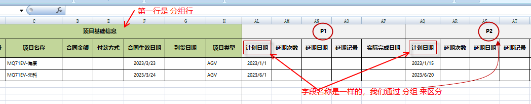 在P1 下面有 計劃日期;在P2下面也有 計劃日期 ,2個字段名稱是一樣的。我們做讀取數(shù)據的時候必須要依賴分組 P1、P2的定義才能區(qū)分
