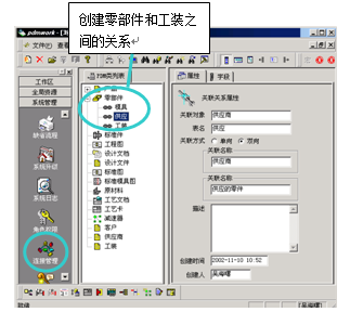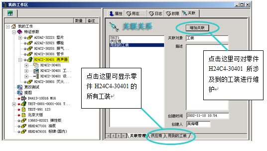 ? ? ? 當(dāng)設(shè)計人員完成了一個零部件的設(shè)計后,其它管理人員可以在”共好”上完善該零部件和工裝等管理信息之間的關(guān)聯(lián)關(guān)系,見下圖: